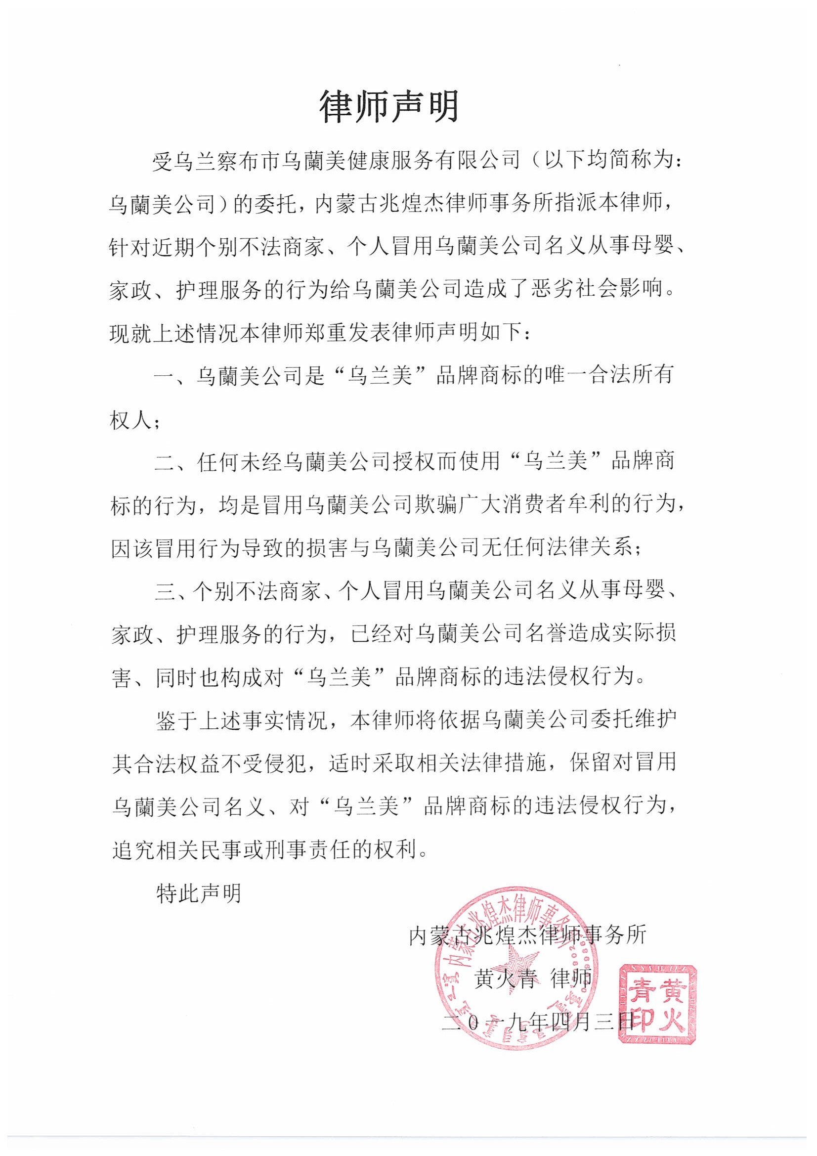 【律師聲明】關(guān)于近期出現(xiàn)冒用烏蘭美品牌的律師聲明發(fā)布時間: 2019-04-04 -